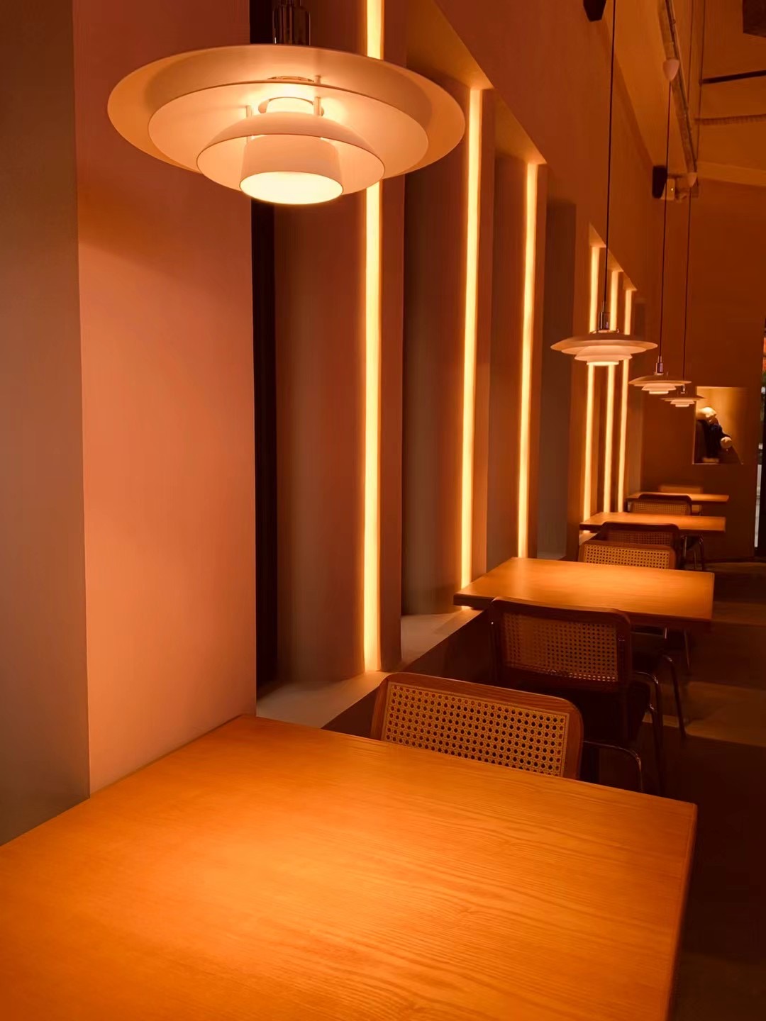 Suitable Lighting Fixture and 2700K led spotlight,emits very soft illumination,create comfortable,warm vibes for customers with good mood to enjoy the food.