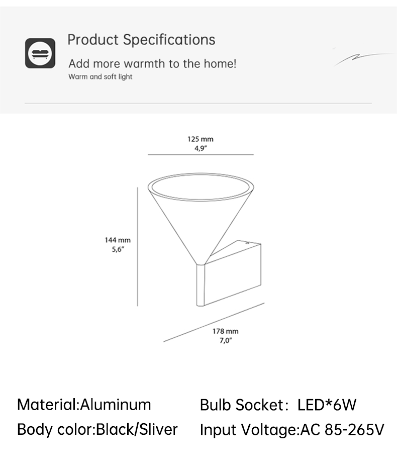 Product Specifications: Material:Aluminum Body color:Black/Silver Bulb Socket:LED*6W Input Voltage:AC 85-265V Product size:D12.5*H12.5*E17.8CM Lighting application:Dining Room,Living Room,Bedroom etc.